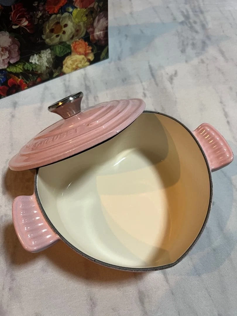 Excellent condition Le Creuset heartshaped pot pink approximately 18cmExcellent condition Le Creuset heartshaped pot pink approximately 18cm