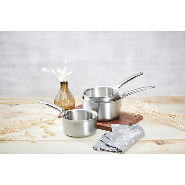 La collection Alchimy de De Buyer propose des casseroles avec fond multicouche 3-ply compatibles sur tous les feux. Ce set contient 3 casseroles de 16, 18 et 20 cm qui sont les dimensions idéales et les plus appréciées pour un usage au quotidien.